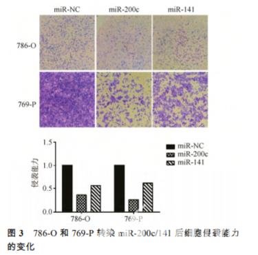 抑制腎癌細胞侵襲遷移 在 786-O 和 769-P 細胞中轉染 miR-200c/141, 2 d 后用 200 μL 槍頭劃線,吸走完全培養基,替換 成無血清培養基,分別在 0,24 h 拍照。轉染了 miR-200c/141 后,細胞遷移能力顯著減弱,見圖 2。 在 786-O 和 769-P 細胞中轉染 miR-200c/141 后, 進行 Transwell 實驗。結果表明,細胞侵襲能力顯 著下降,見圖 3。因此,miR-200c/141 可以抑制腎 癌細胞系 786-O 和 769-P 的侵襲遷移能力。