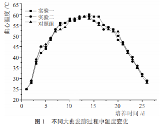 通過不同環境調控方式培養的大曲,發酵過程中曲心溫 度的變化趨勢趨于一致,均符合前緩中挺后緩落的變化趨勢 (見圖 1)。不同的是,實驗一大曲前期升溫相對更緩,中期挺 溫時間分別較實驗二和對照組高 2d、1d,頂溫也相對高 1℃。