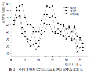 大曲發酵過程中環境濕度的控制是直接影響大曲質量 的重要因素之一,對比圖 2 不同環境調控方式下大曲發酵過 程中濕度的變化情況,可見,相比對照組,通過草簾的適當運用及發酵室整體空間環境的調整,實驗一可顯著提升發酵過 程中前中期的濕度,有利于曲坯的穿衣和保溫保潮。