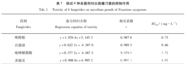 使用 EXCEL2016,DPS7. 05 數(shù)據(jù)處理軟件對所得的數(shù)據(jù)進行統(tǒng)計分析,得出各藥劑的 毒力回歸方程、EC50和相關(guān)系數(shù)。