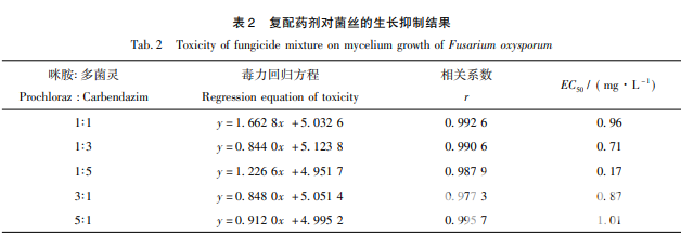 選取 2 種藥效作用較好的藥劑進行復(fù)配,以 EC50濃度按照不同比例配比,配比為 1∶ 1, 1∶ 3,1∶ 5,3∶ 1,5∶ 1。再在不同比例配比下設(shè)置 5 個濃度梯度,濃度稀釋按照逐級稀釋法稀釋濃度,實驗按 照 1. 2. 2 和 1. 2. 3 中所述方法進行。
