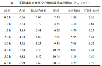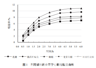 選取制粒常用輔料乳糖、可溶性淀粉、微晶纖維 素、麥芽糊精、糊精,分別與浸膏粉按 1∶1 比例混 勻,干法制粒(送料速度 30 r/min、滾輪轉(zhuǎn)速 4 r/min、 滾輪壓力 60 MPa),并按“2.2.1”項(xiàng)下方法測定所制 顆粒的吸濕率,繪制吸濕曲線,結(jié)果見表 1、圖 1。