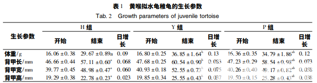 由表 1 可知,經(jīng) 154 d 試驗,各組稚龜?shù)钠骄赵鲋? P 組為 0. 12 g,與 Y 組的 0. 13 g 很接近, 而比 H 組的 0. 09 g 大. 稚龜?shù)纳L速度表現(xiàn)為 Y 組最快,P 組次之,H 組最慢. 經(jīng)方差檢驗,P 組 與 Y 組的生長差異不顯著,其他項的差異程度詳見表 1.