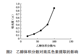 用6種不同的料液比對南瓜色素進行提取,試驗 結果如圖1所示。可看出南瓜色素的吸光度在0.1~0.3 之間,曲線呈下滑趨勢,料液比越低,南瓜色素的提 取效果越好。料液比較低,曲線下滑很快,在1︰ 8~1︰12(g/mL)間處于較平穩狀態;料液比較高, 南瓜色素的吸光度繼續快速下降,考慮到試驗的方便 性,可選擇1︰10(g/mL)的料液比作為南瓜色素提 取的條件。 用5種不同的乙醇體積分數對南瓜色素進行提 取,試驗結果如圖2所示。可看出乙醇體積分數對南 瓜色素的提取曲線呈上升趨勢,且越來越陡,當乙醇 體積分數為100%時吸光度達到最大值,因此當乙醇 體積分數為20%,40%,60%和80%時南瓜色素的提 取效果均不好,無水乙醇效果最好。