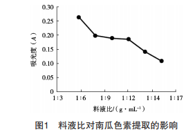 稱取6份南瓜,每份5 g。其他條件相同時,用體 積分數95%乙醇,以不同料液比(1︰6,1︰8,1︰10,1︰12,1︰14和1︰16 g/mL)加入碎狀南瓜中, 將其放入50 ℃恒溫箱中浸提2 h。將得到的浸提液離 心后,稀釋到相同倍數,在446 nm波長下用7200可見 分光光度計分別測其吸光度。