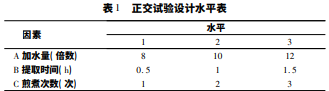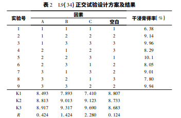 經過前期數次預實驗以及參考 其他可知,對水提法提率影響主要的因素為 加水量、提取時間和提取次數。我們以這三個因素作 為考察因素,每個因素取 3 個水平,因素水平設計參考 其他中藥制劑并結合生產實際。加水量分別為 8 倍 量、10 倍量、12 倍量; 提取時間一般為 1 h,故設計為 0. 5、1、1. 5 h; 提取次數一般為 1 ~ 3 次。按照 L9( 34) 正交表進行正交試驗,以干浸膏得率作為評價指標,篩 選最佳提取工藝。見表 1、2。
