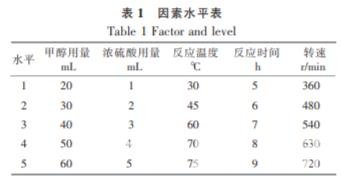 固定小球藻藻粉的質量為 5 g, 選取甲醇用 量、催化劑(濃硫酸)用量、反應溫度、反應時間和 攪拌速度為試驗因素,每個因素考察 5 個水平,采 用 L25(56 )正交試驗表設計正交試驗,分析比較不 同條件下小球藻生物柴油的產率。 表 1 為因素水 平表。