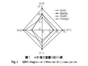 (quantitative descriptive analysis, QDA)法評價豆醬樣品的質量 QDA是一種以描述性分析為主的對樣品進行感官評 定的方法,利用多元統計方法分析獲得數據,對樣品進 行定性和定量相結合的分析。具體分析過程為:首先挑 選評定員組成定量描述分析小組,提出并挑選能反映樣 品感官特性的描述詞匯,然后采用線性標度對其進行評 價打分,打分結束后進行統計分析,用雷達圖直觀表示 對測定樣品的質量評價。本研究挑選10 名評定員,從色 澤、香氣、滋味和體態4 個方面對不同地區的發酵豆醬樣 品進行質量評價,評價結果采用QDA圖表示。