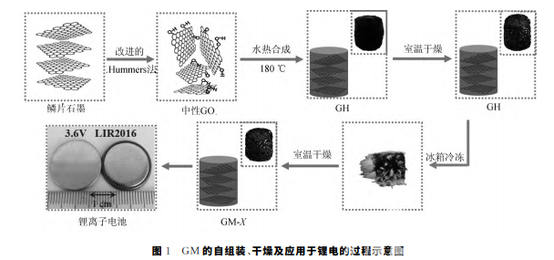GM-X 自組裝、干燥及應(yīng)用于鋰電的過(guò)程如圖1所 示.采 用 改 進(jìn) 的 Hummers法制 備 出 中 性 GO溶液作為原料,然后180 ℃下采用水熱反應(yīng)將其合成為石墨烯水凝膠 GH,經(jīng)室溫干燥一段時(shí)間后,將 其送入冰箱中冷凍處理48h后再在室溫下放置至完全干燥,得到樣品 GM-X,將其應(yīng)用于鋰離子電池 的負(fù)極材料研究中。