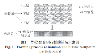 按幅面尺寸為350 mm×350 mm×14 mm,目標(biāo)密 度為(660±20)kg/m3 壓制三層結(jié)構(gòu)竹/塑復(fù)合刨花 板。分別稱取定量的竹刨花、UF膠和PE粉末。首先, 將竹刨花按照1:8:1 的比例分成3 份,分別用于刨花板 的上中下三層;其中,PE粉末僅在芯層添加,在添加之 前,先將質(zhì)量分?jǐn)?shù)為0.3%的KH560 均勻噴灑在PE粉 末上面,然后將處理后的PE粉末加入芯層竹刨花中混 合均勻,再對(duì)上中下層的竹刨花分別均勻施膠;人工分層均勻鋪裝(見圖1);預(yù)壓;在2.5 MPa的壓力條件下 熱壓成型,并靜養(yǎng)48 h;最后制備試樣。
