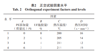 在現(xiàn)有竹材刨花板的生產(chǎn)工藝基礎(chǔ)上,采用L16(45 ) 正交試驗(yàn)設(shè)計(jì)考察PE添加量、UF膠用量、熱壓溫度及 熱壓時(shí)間對(duì)竹/塑復(fù)合刨花板物理力學(xué)性能的影響。 L16(45 )正交試驗(yàn)因素水平如表2 所示。