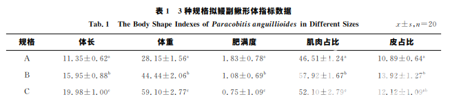 1)不同規(guī)格的擬鰻副鰍,其形體指標(biāo)隨規(guī)格的增大,均呈現(xiàn)先增大后下降趨勢,中等規(guī)格的鰻鰍肌肉占 體質(zhì)量比例最高.